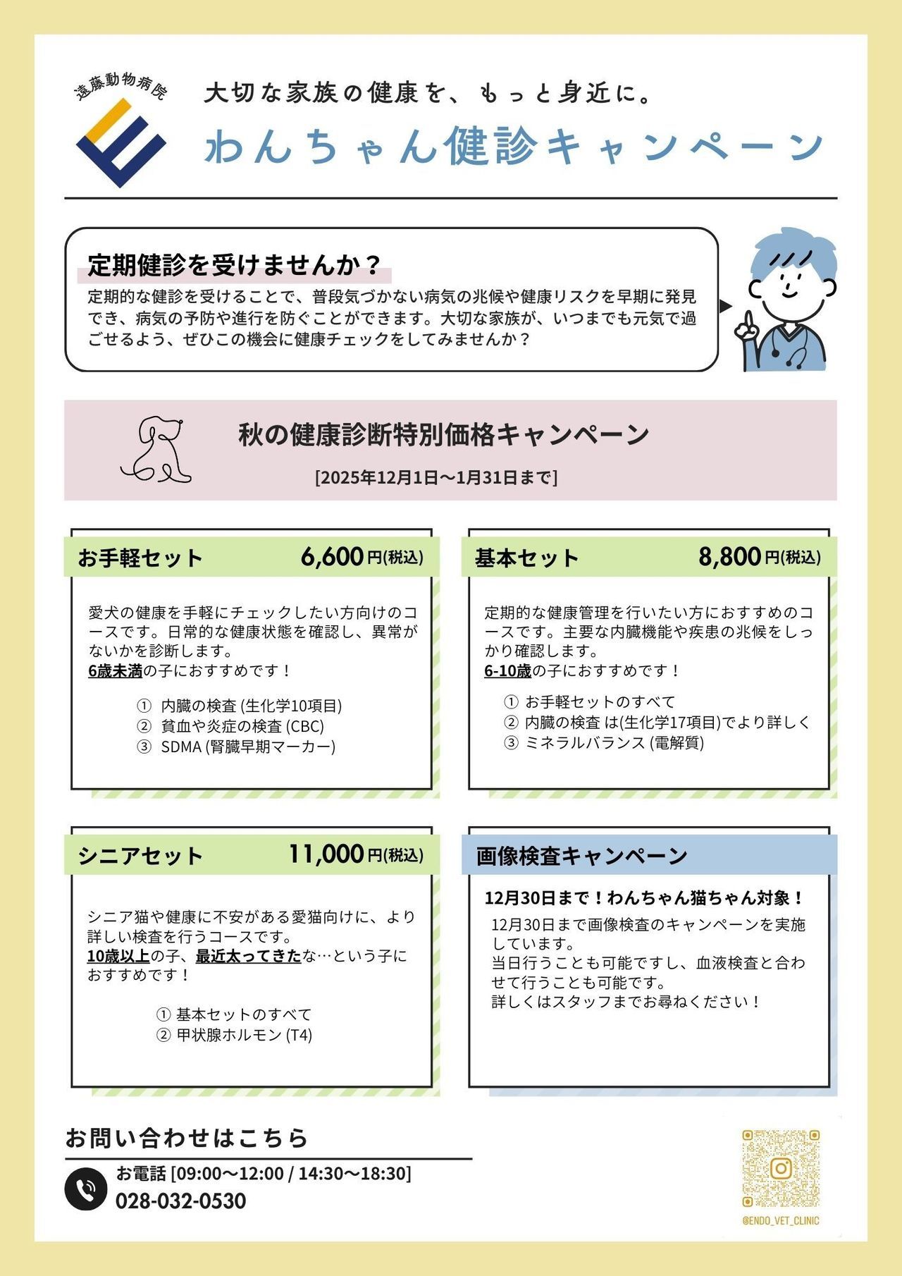 | 2025/4/1 | 病院移設は無事終了し3/28(金)より診療を再開しています。引き続き遠藤動物病院をよろしくお願いいたします。 気になる点がございましたらお気軽にお問い合わせください。 |